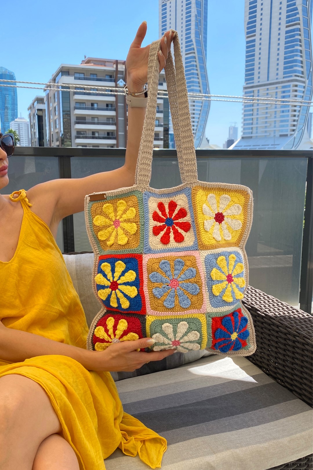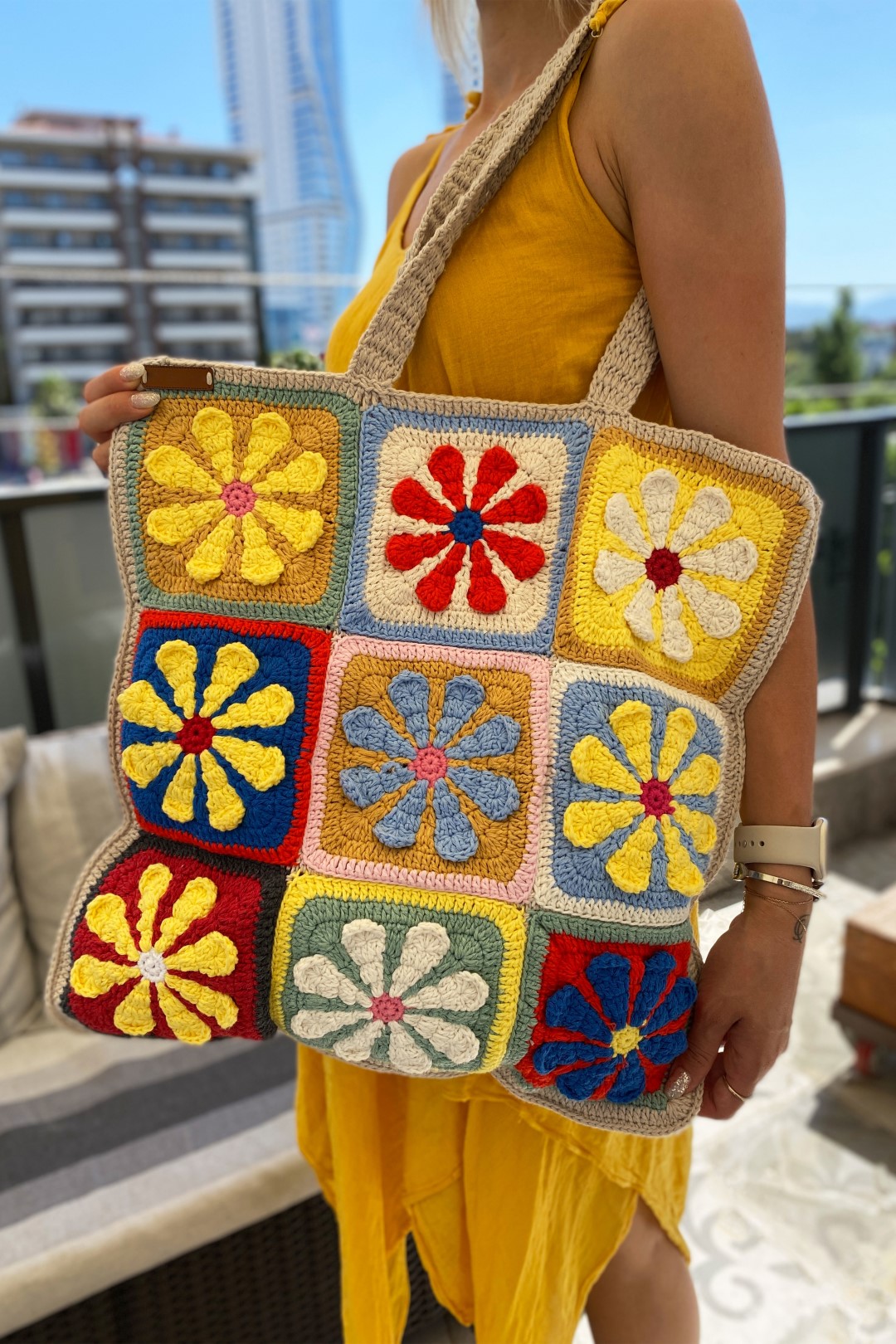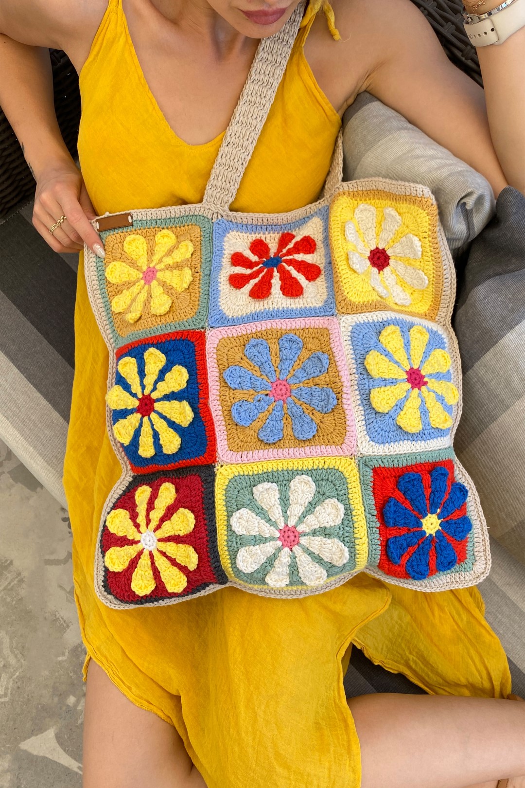 Çanta Ölçüsü: 43x43 cm Çanta Sap Ölçüsü: 66 cm El yapımı olması nedeniyle modeller arasında + veya - birkaç cm fark oluşabilmektedir.