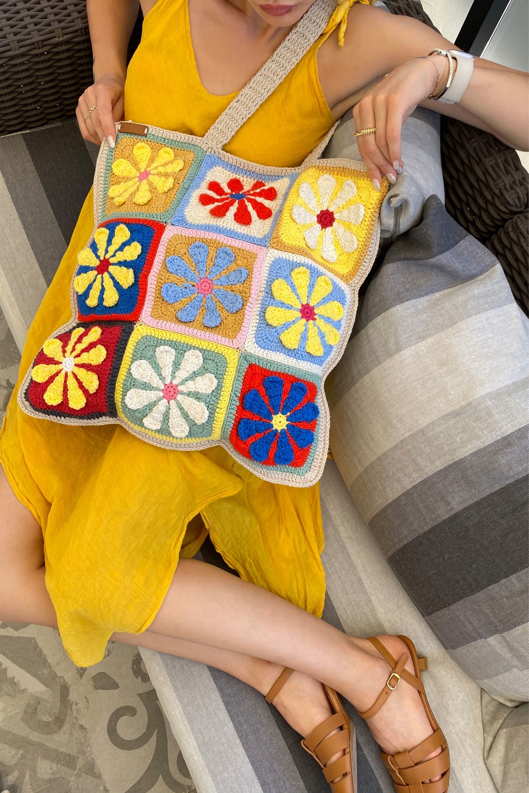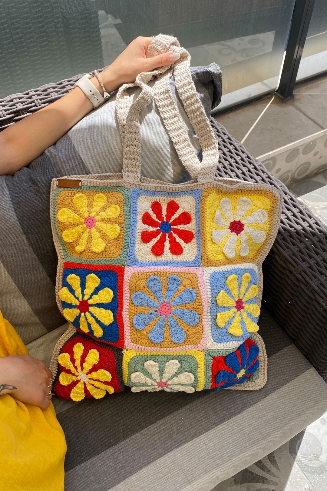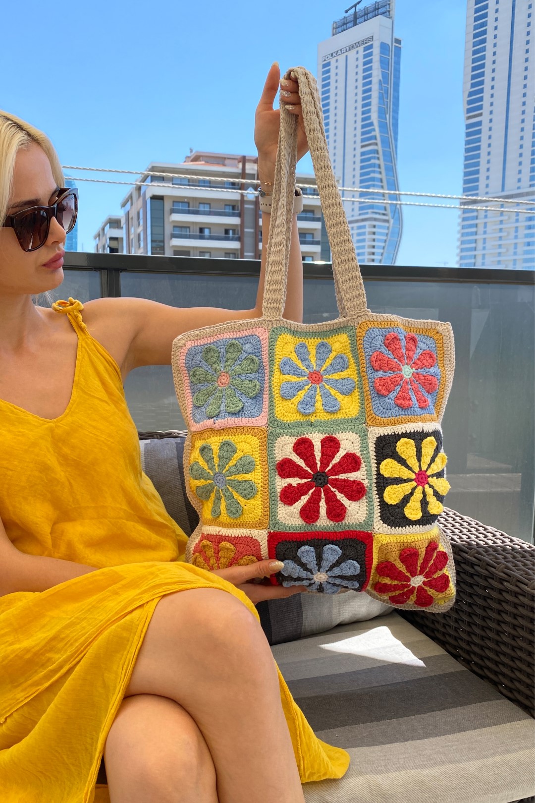 Çanta Ölçüsü: 43x43 cm Çanta Sap Ölçüsü: 66 cm El yapımı olması nedeniyle modeller arasında + veya - birkaç cm fark oluşabilmektedir.