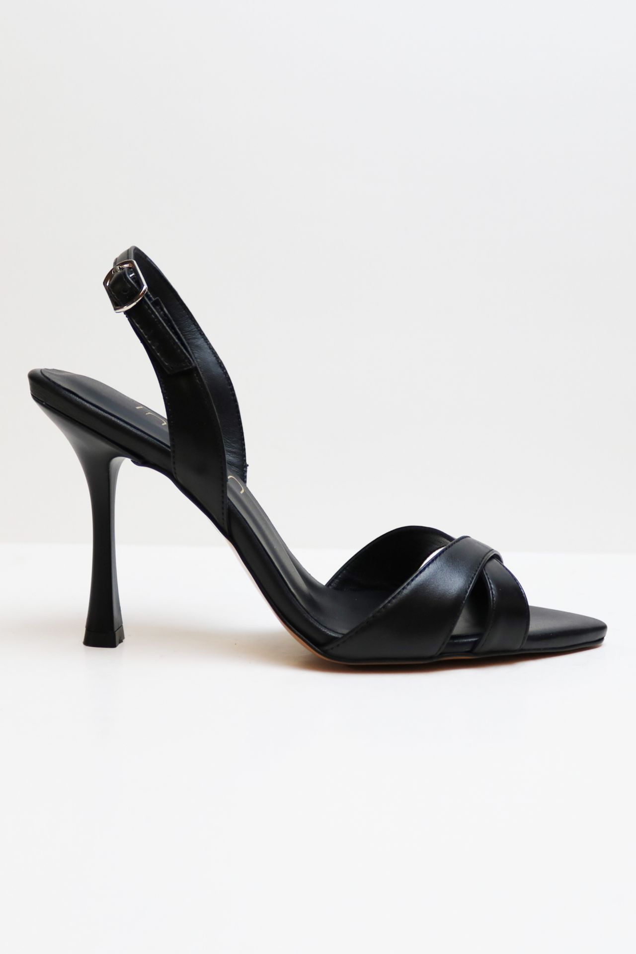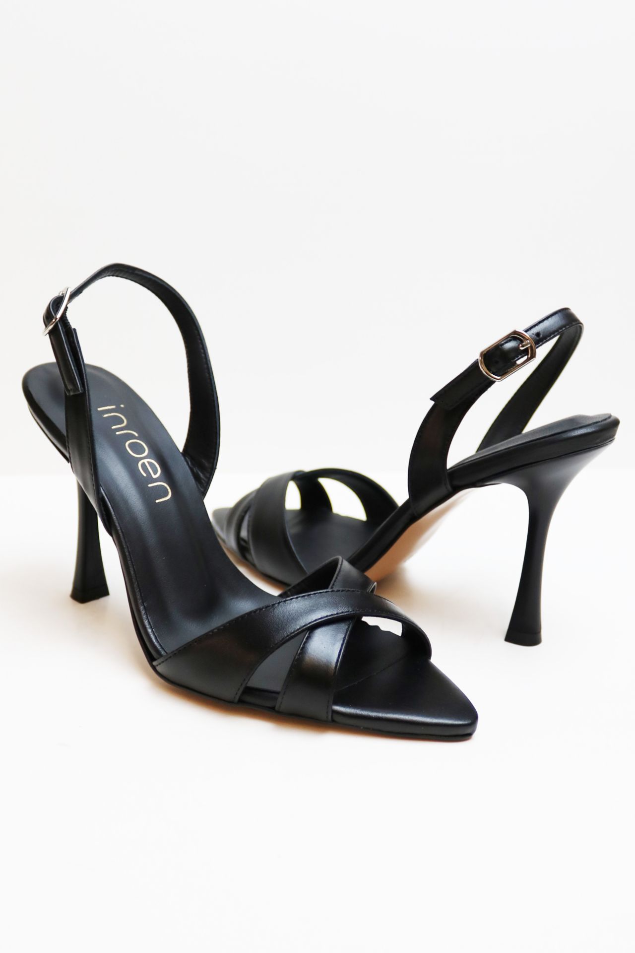 Sivri Burun Çapraz Bantlı Hakiki Deri Topuklu Ayakkabı SİYAH
